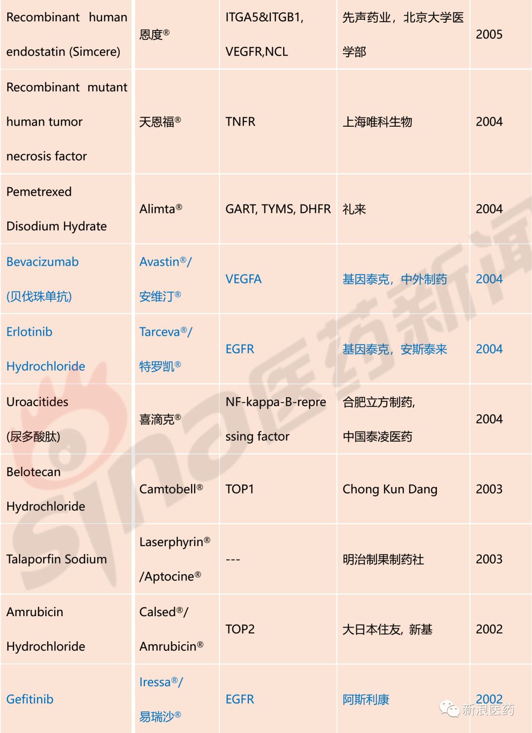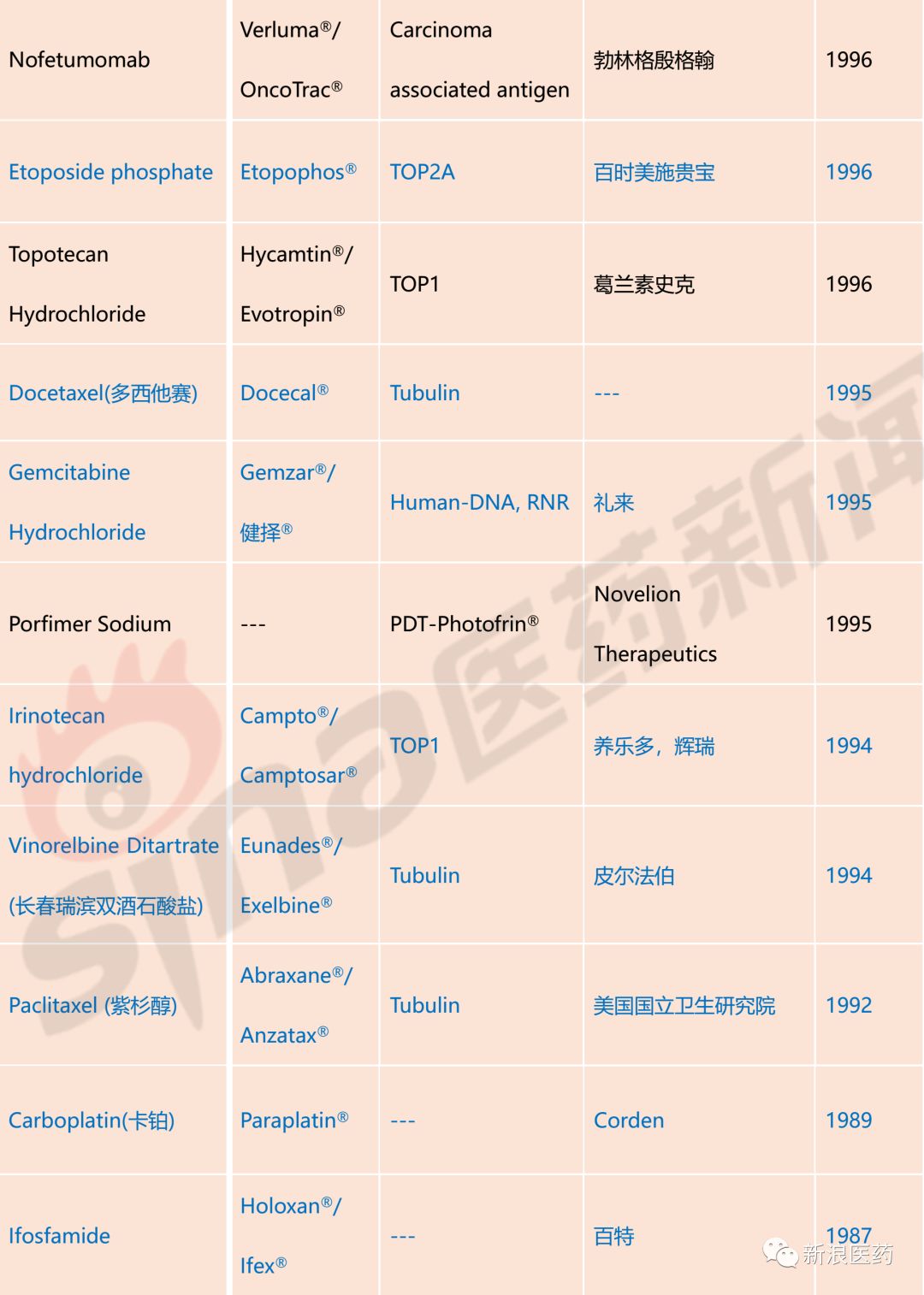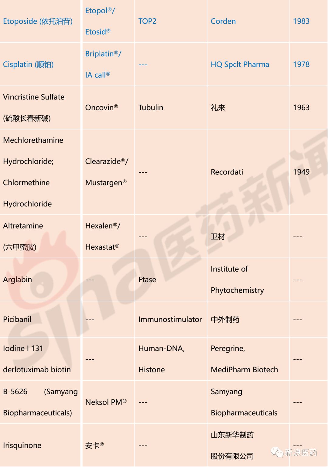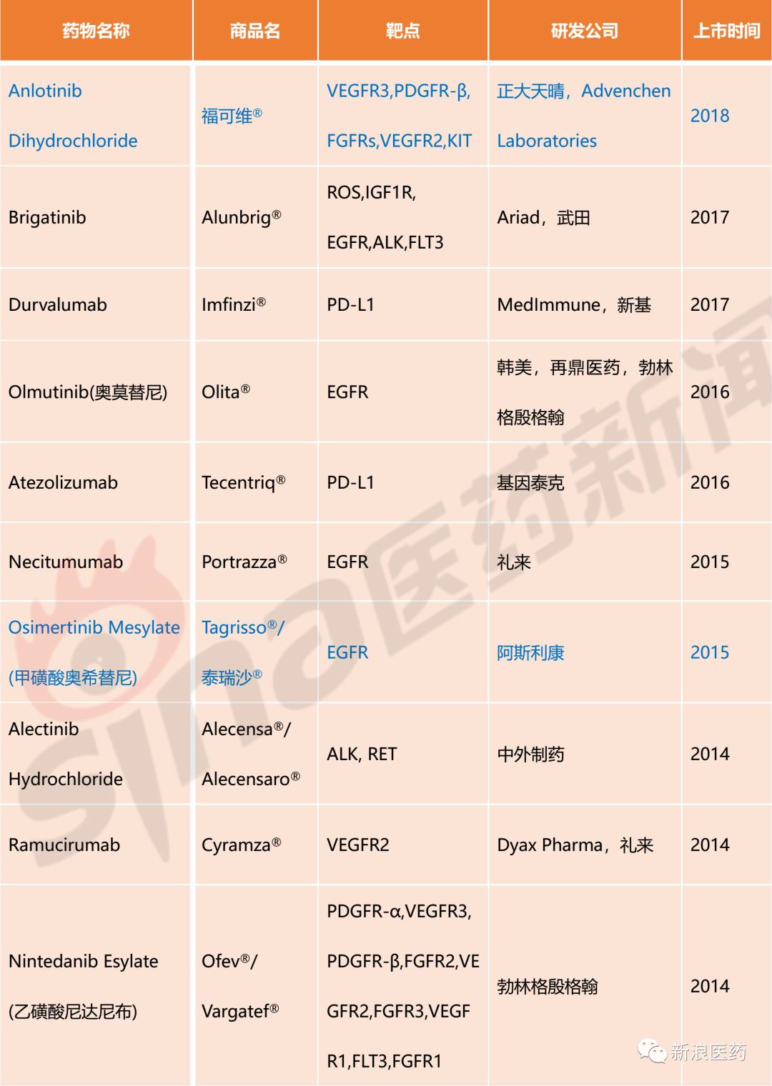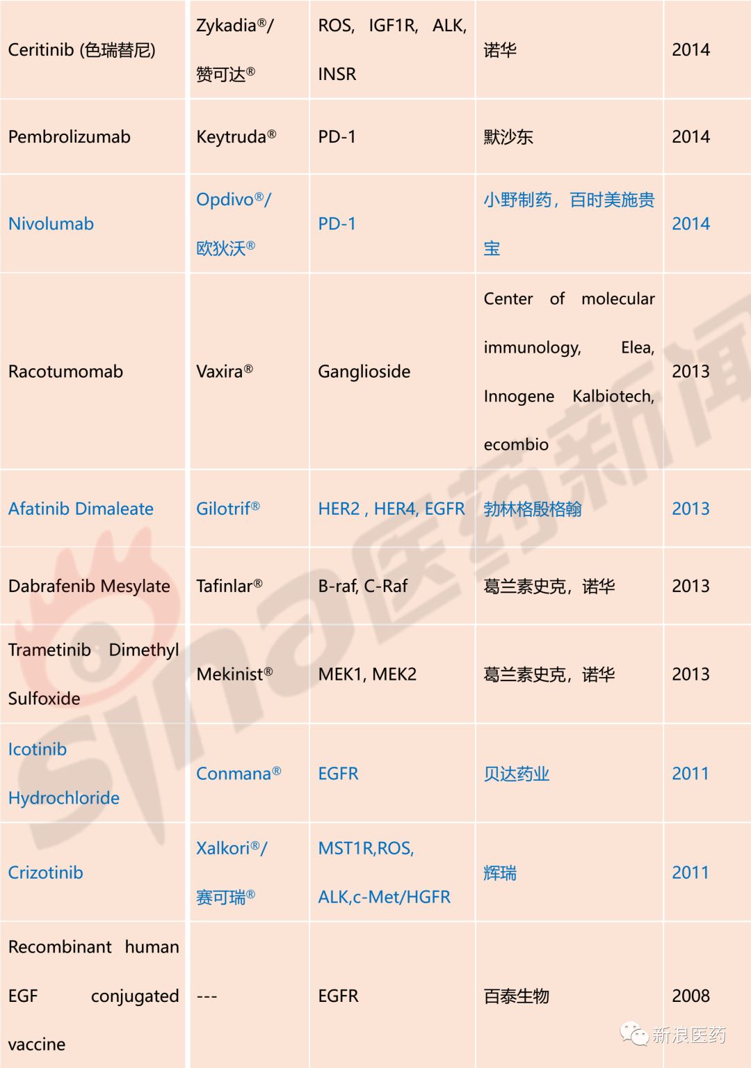通过药渡数据库查询,截至成稿(2018.7),当前针对于肺癌治疗的药物,上市品种58个、NDA 状态品种16个、BLA 品种3个、三期临床品种94个、二期临床品种225个、一期临床品种155个。其中,临床状态处于进行中的312个,无进展的55个,终止的138个;由于产品线过于庞大,下面给出部分已上市药物相关信息(注:蓝色字体为指南涉及药物)。